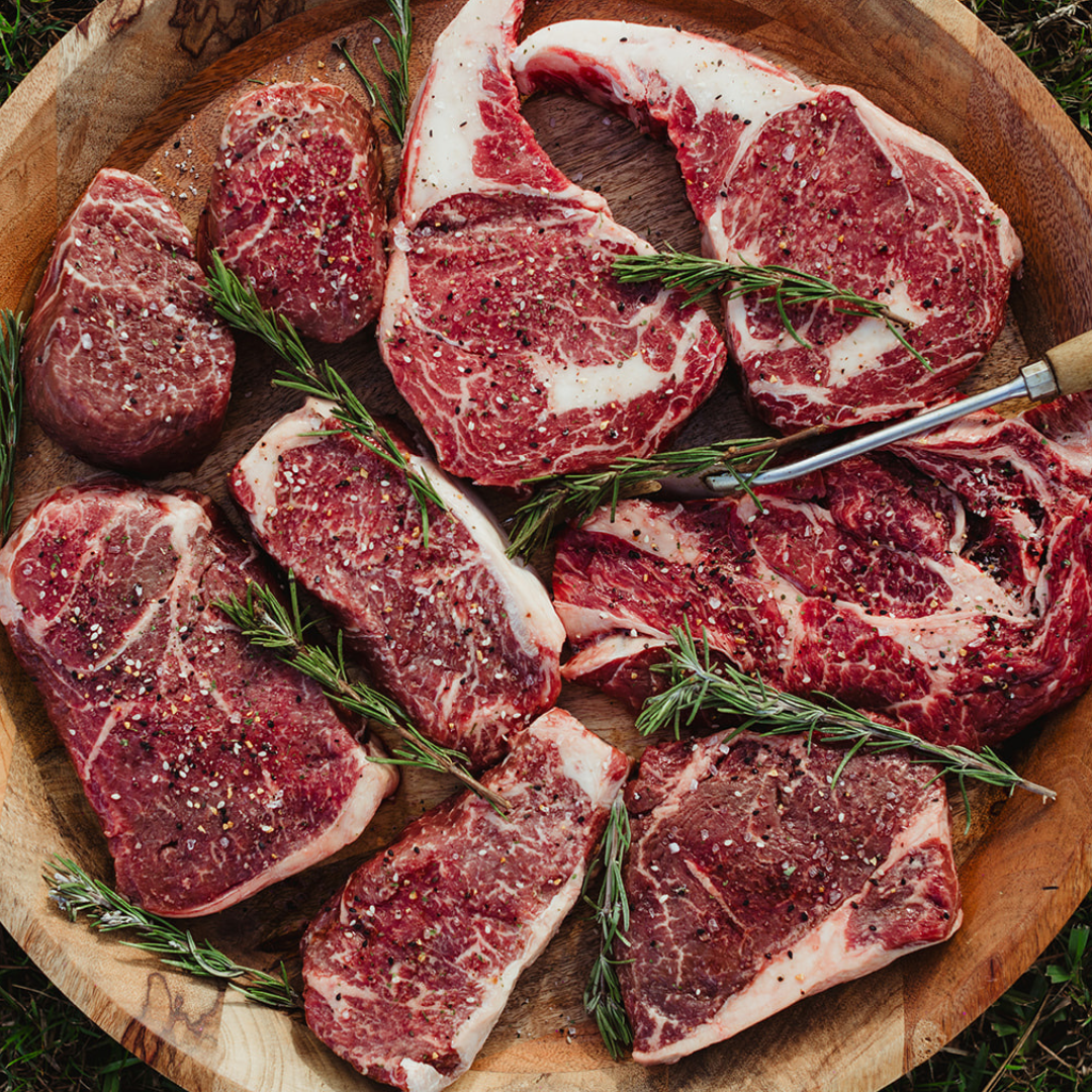 Superior beef begins with superior genetics. We raise F1 cross cattle by breeding our registered Akaushi Wagyu bull with registered Angus cows. Wagyu are known for their high marbling content and elevated levels of oleic acid, a healthier monounsaturated fat. This results in beef that not only boasts exquisite marbling but also offers heart-healthy benefits by lowering cholesterol. During cooking, the marbling melts down, infusing the meat with the delicious buttery flavor that Wagyu is known for. Our carefully crafted crossbreeding approach guarantees a consistently delightful eating experience with every order.