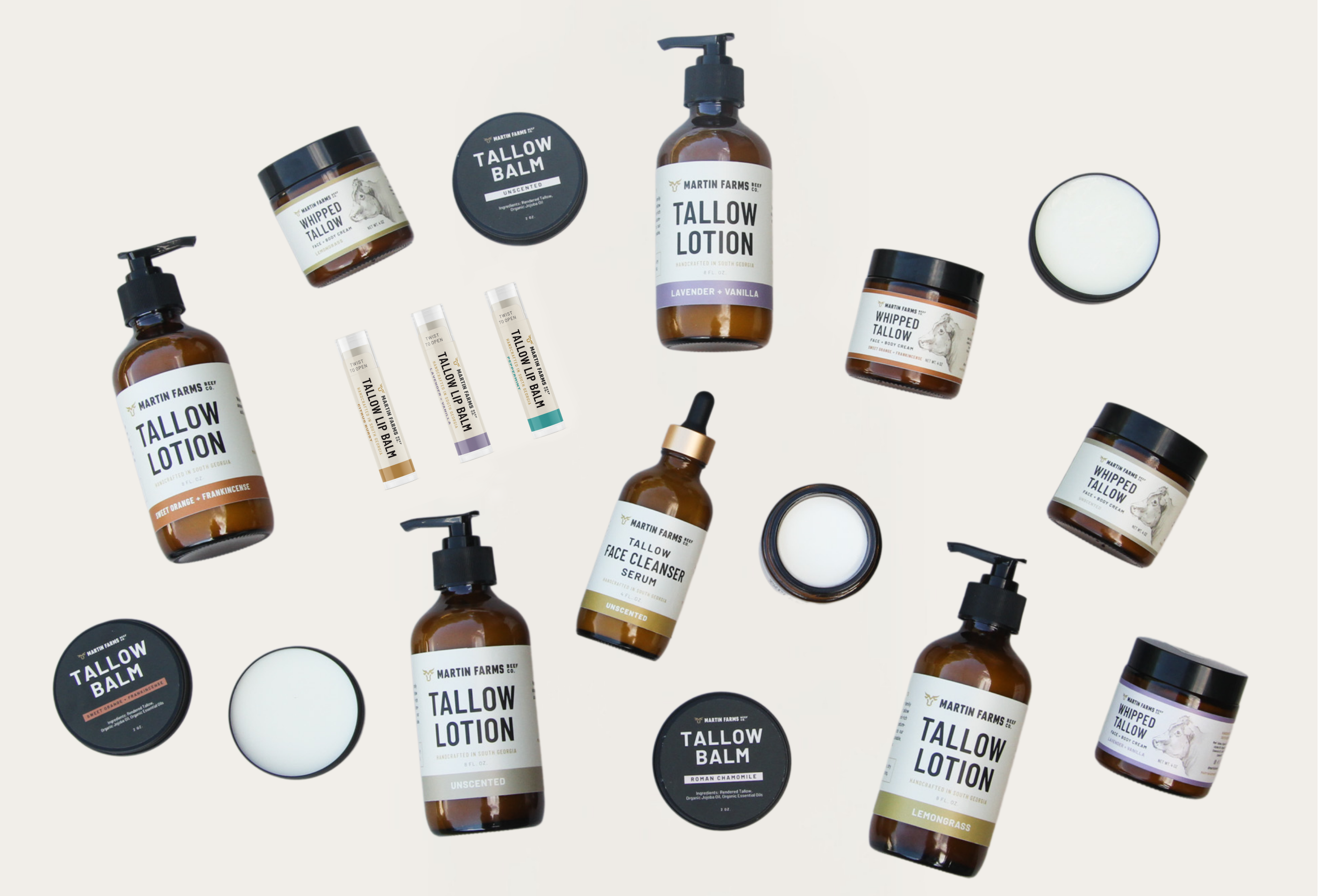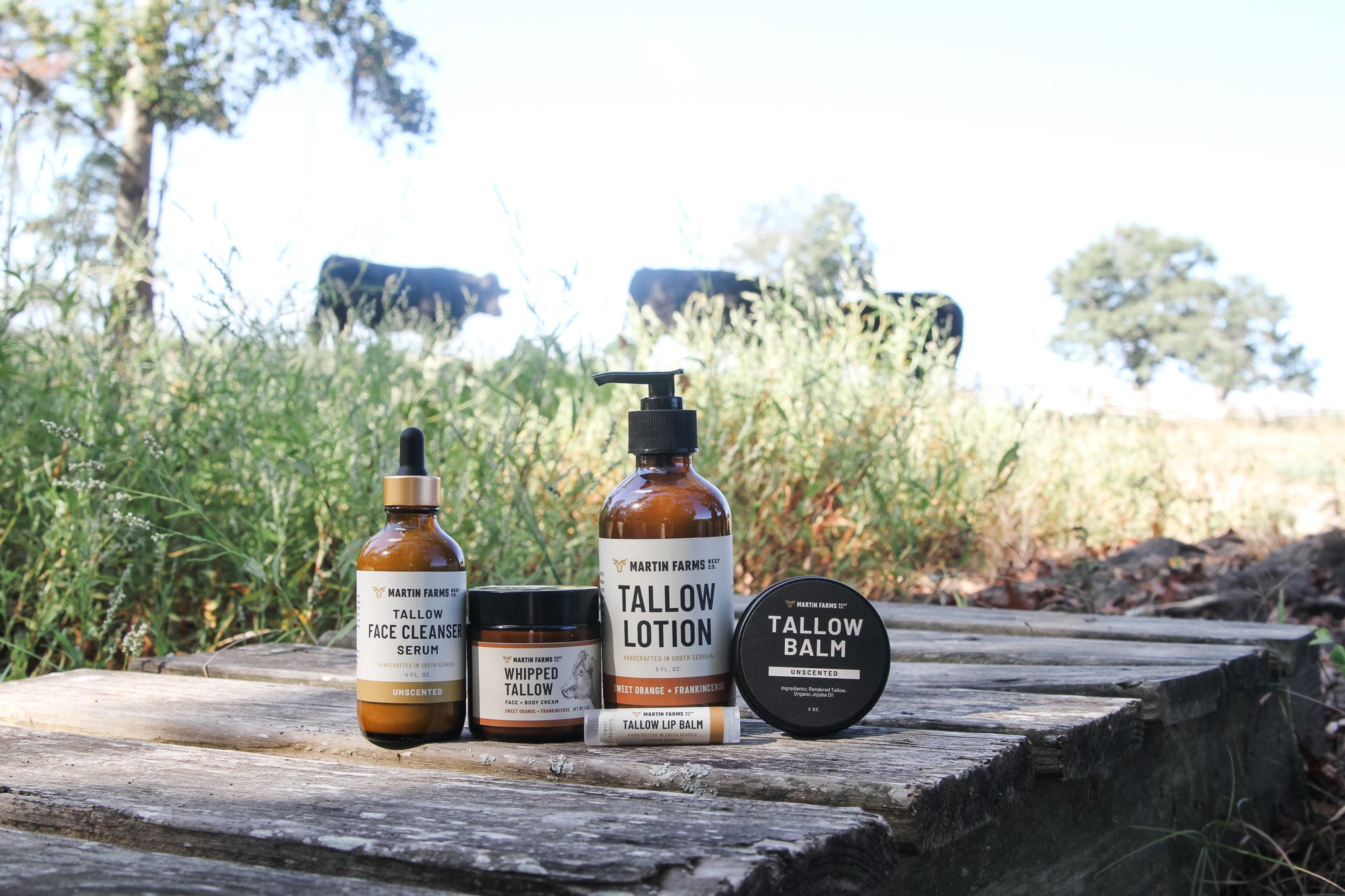 Every product starts with beef tallow rendered from our own cattle — rich in vitamins A, D, E, and K and closely mimics your skin's natural oils. From there, we only add what's needed.